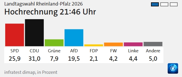 • CDU: Wird laut tagesschau.de stärkste Kraft (ca. 30,6 %) unter Gordon Schnieder, der als Favorit für das Ministerpräsidentenamt gilt.